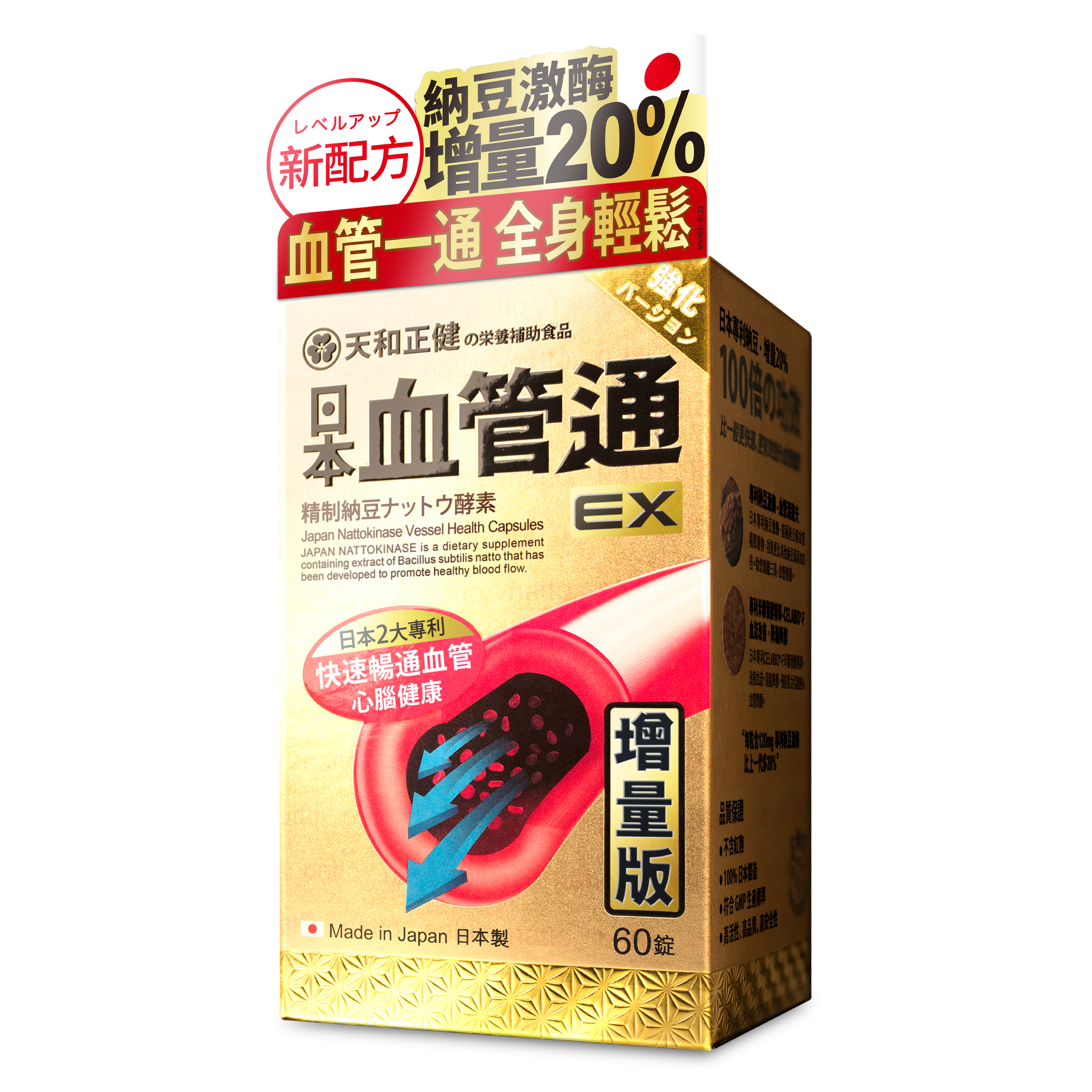 新一代【日本.血管通】增量版EX,納豆激酶增量20%,以北海道專利低温技術,提煉出對溶解血管斑塊最有效的專利「納豆激酶」,功效比一般納豆素高出100倍,助您溶解血管廢物、暢通血管,遠離三高及保持心血管健康!