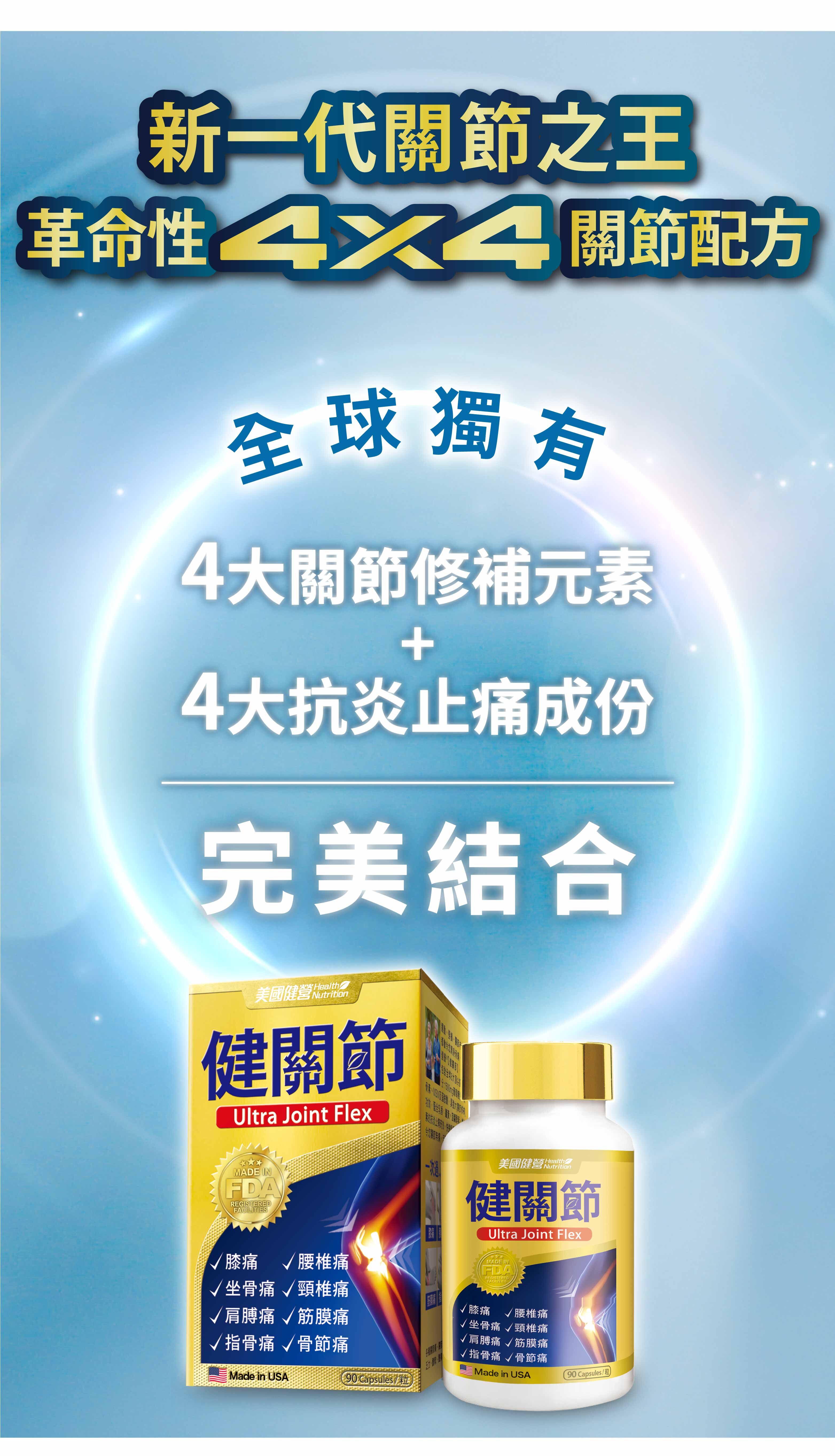運動、勞損、關節老化,都會令您「周身骨痛」,要全面解決關節問題,依靠單一成分並不足夠。您需要全新革命性[4X4]關節配方,1樽包含全球8大頂尖關節成分的【美國健營®健關節】。