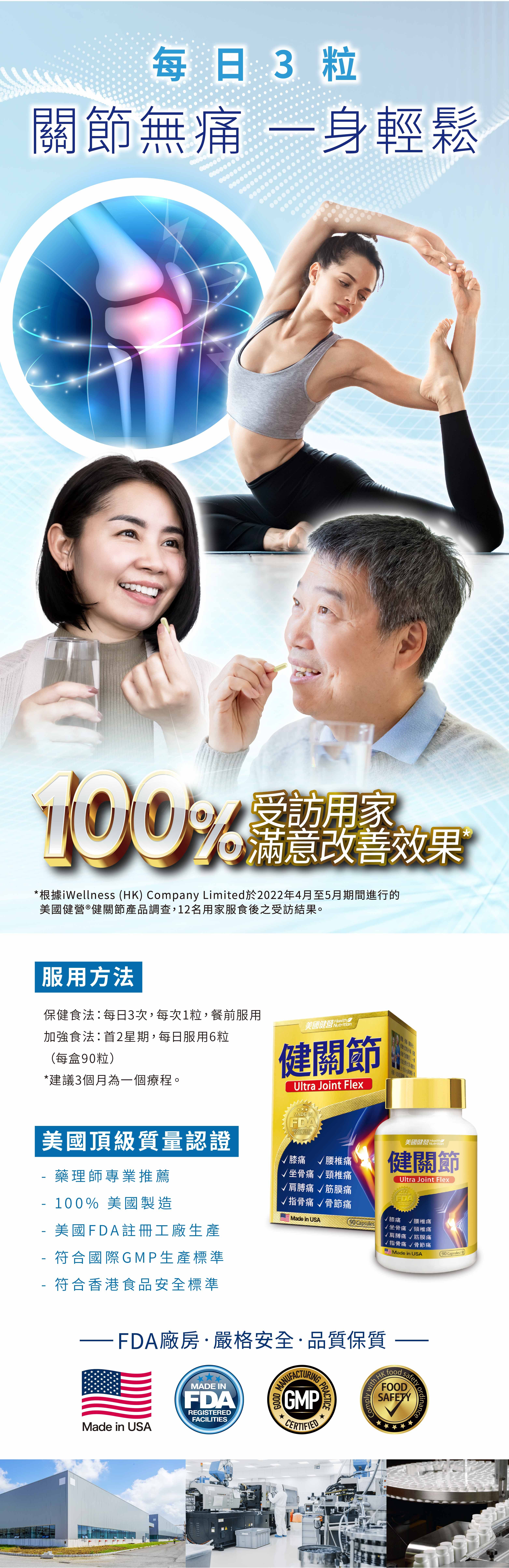 香港用家實證,大部份受訪者表示,服用【健關節】3個月後有顯著改善,最快更在短短3日,關節唔痛、改善僵硬及腫脹。只需每日3粒,解決膝痛、坐骨痛、頸椎痛、肩頸痛、腰椎痛、指骨痛、筋膜痛、骨節痛等8大周身骨痛,咯咯聲不再,越行越有力!