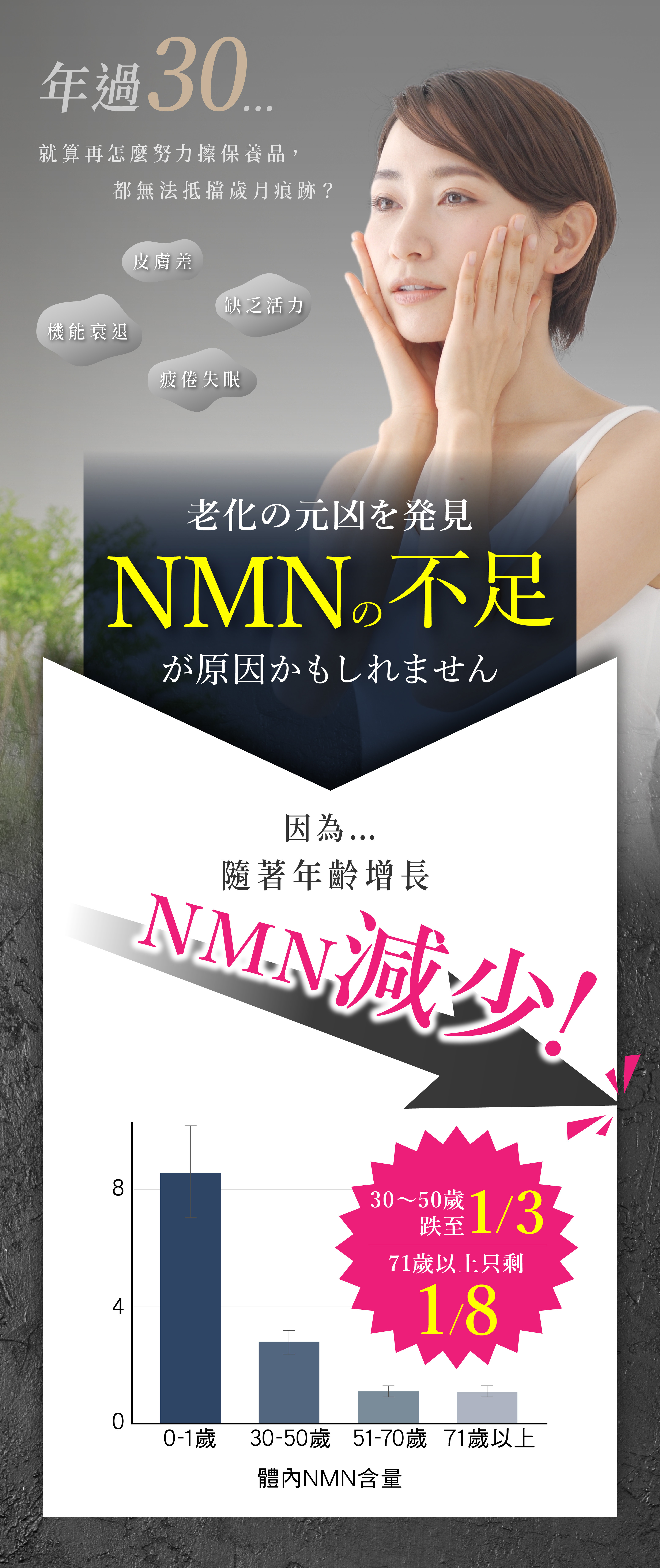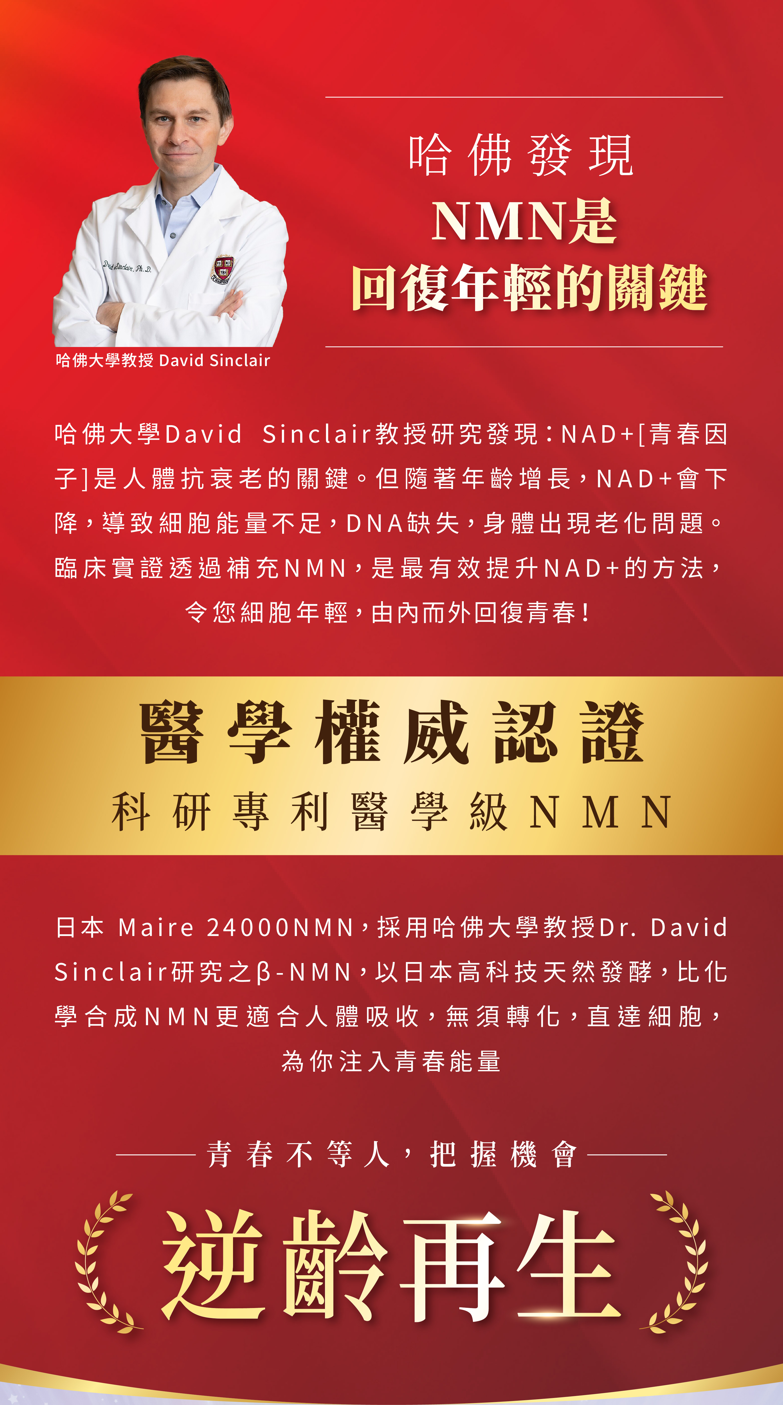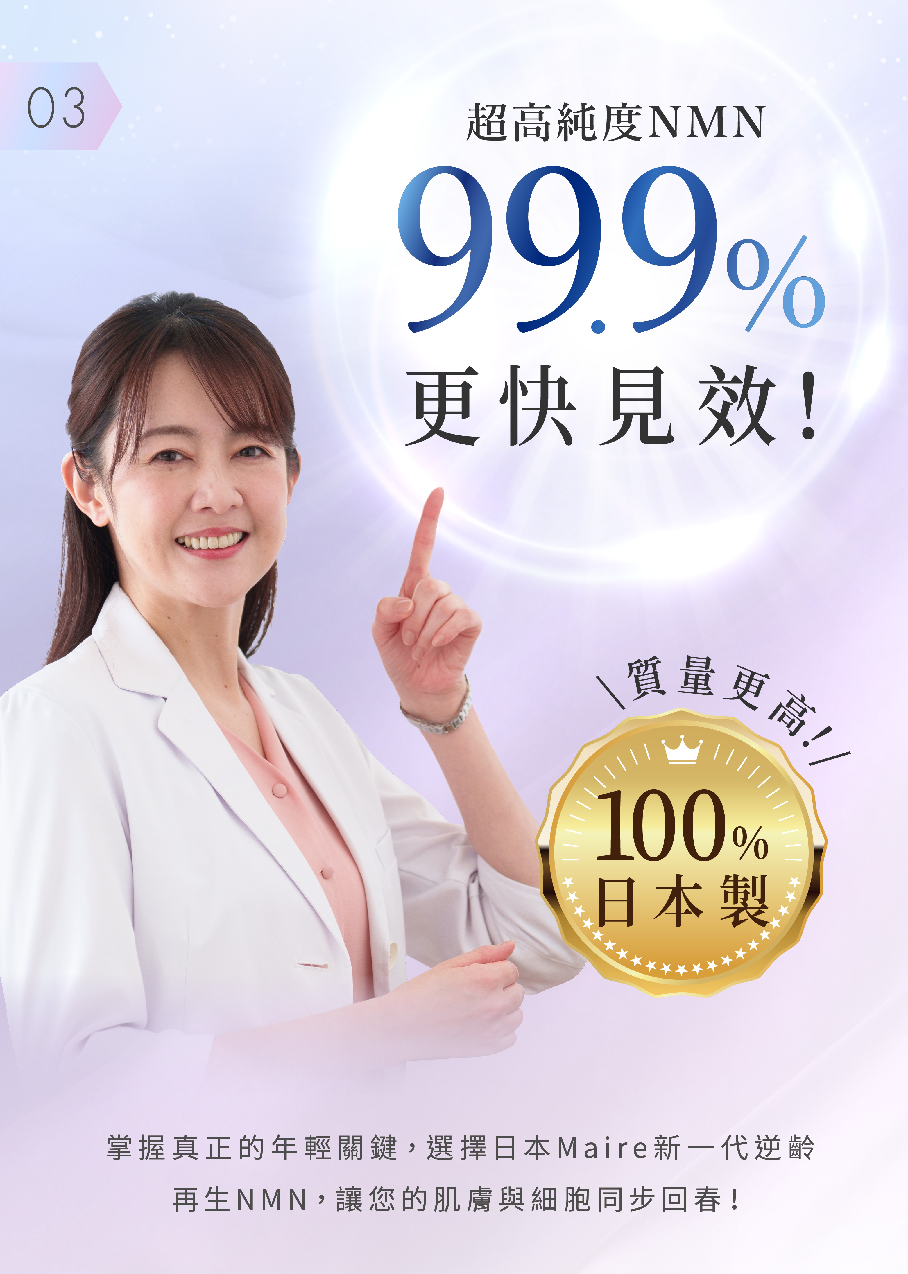 日本99.9%純度天然β-NMN, 以突破性技術,3倍提升NAD+青春因子水平,令全身細胞逆齡再生。