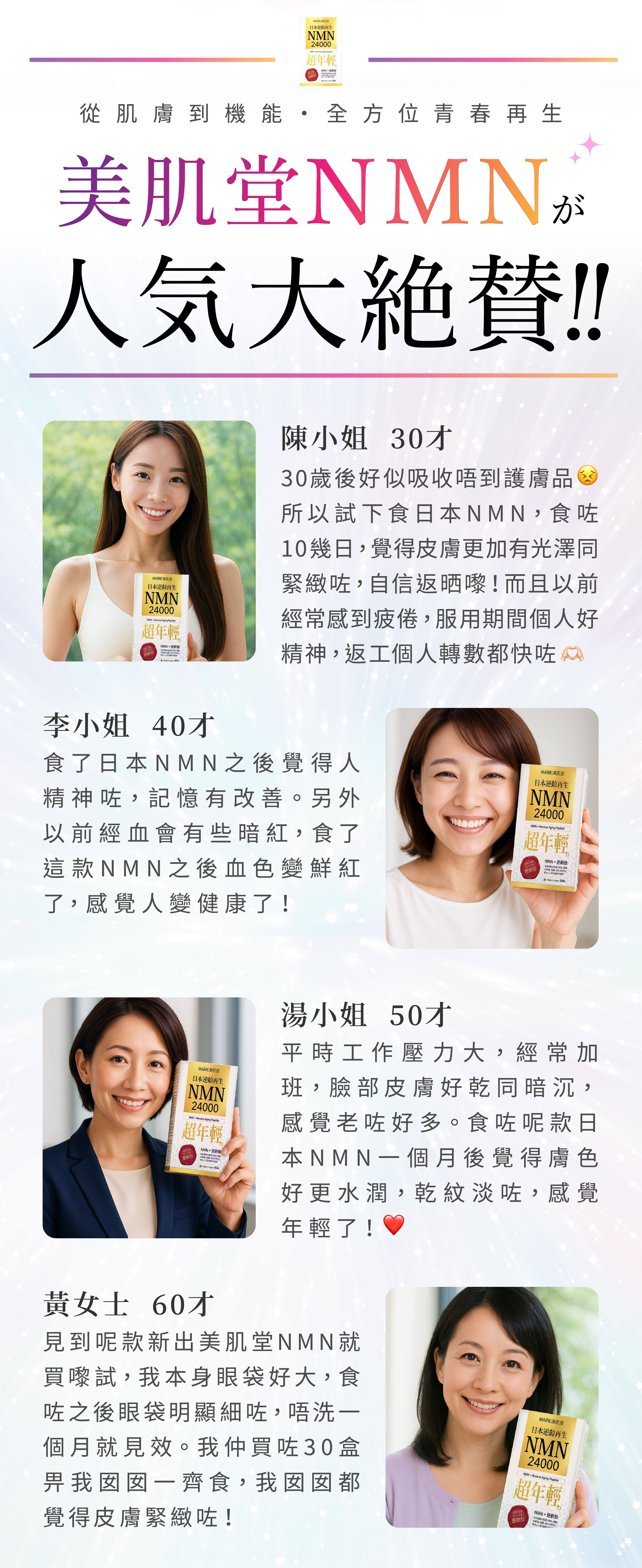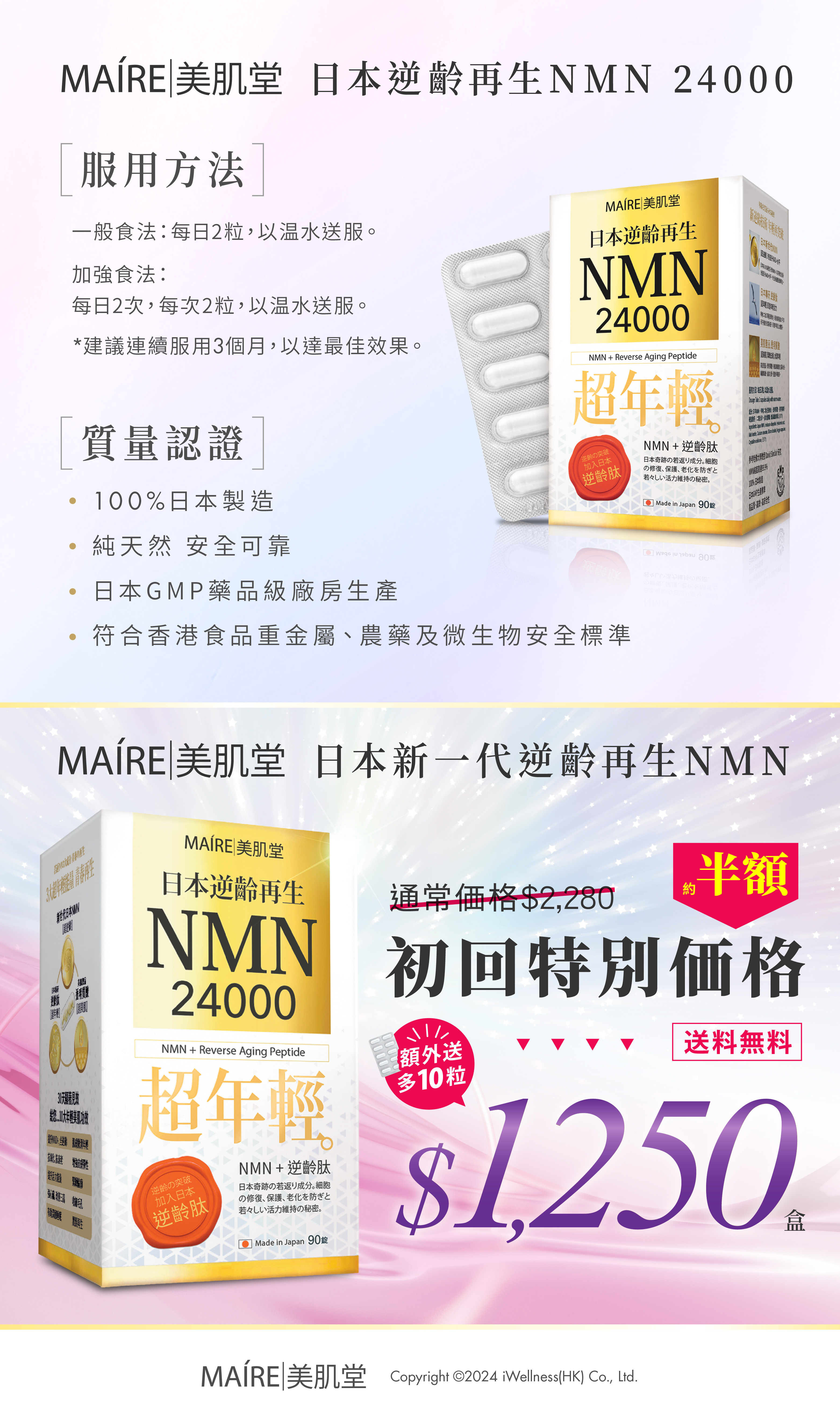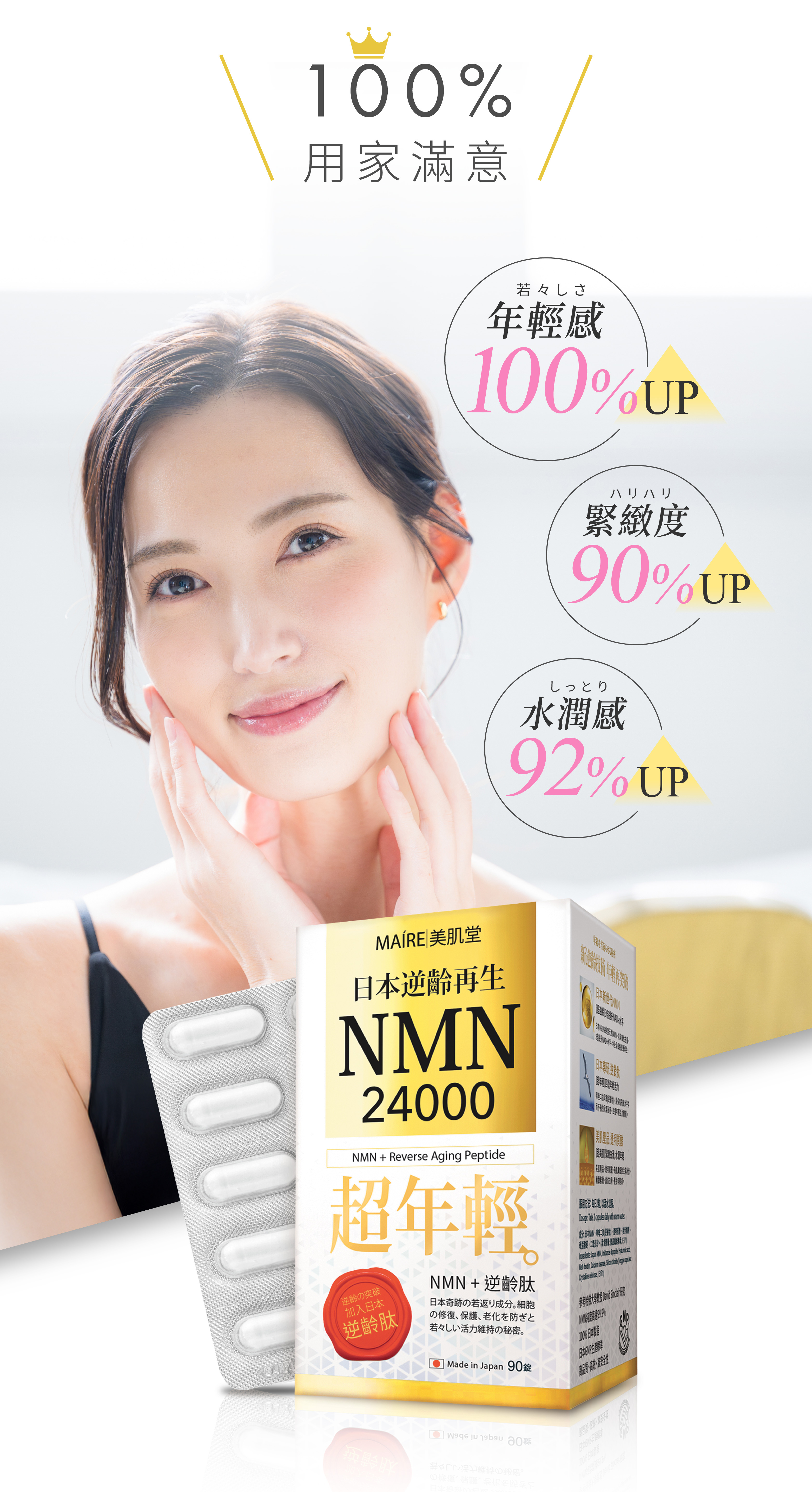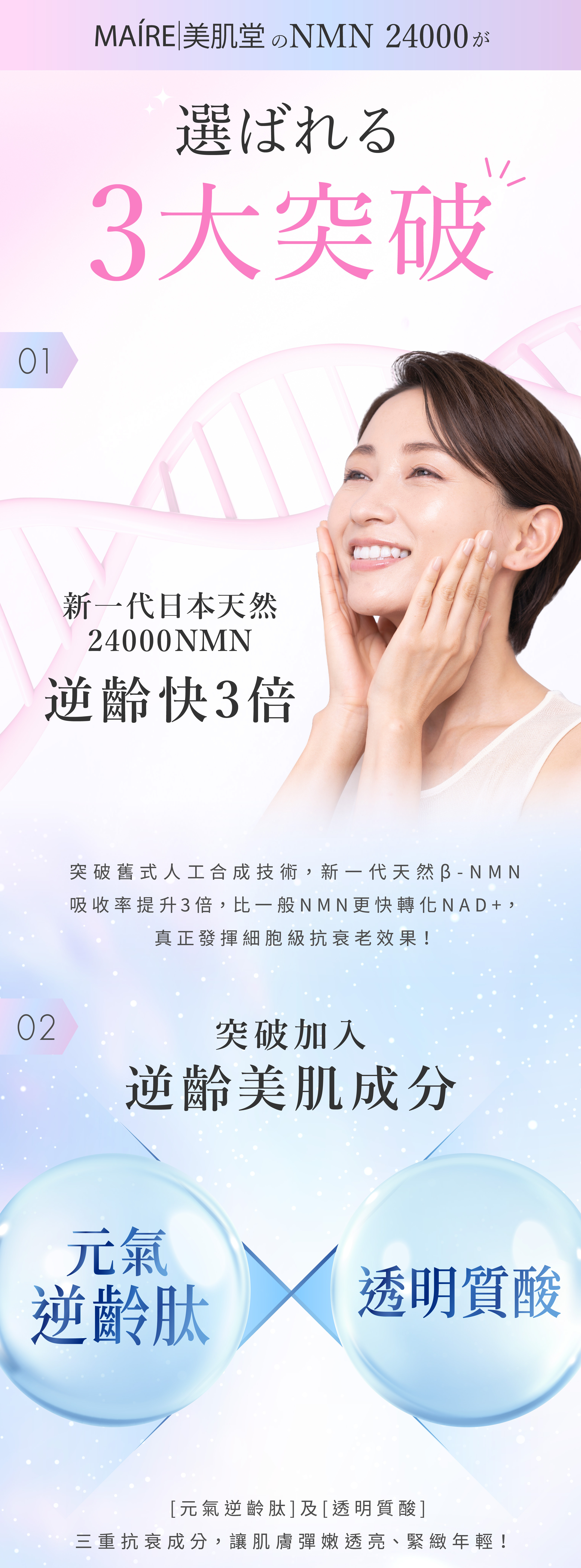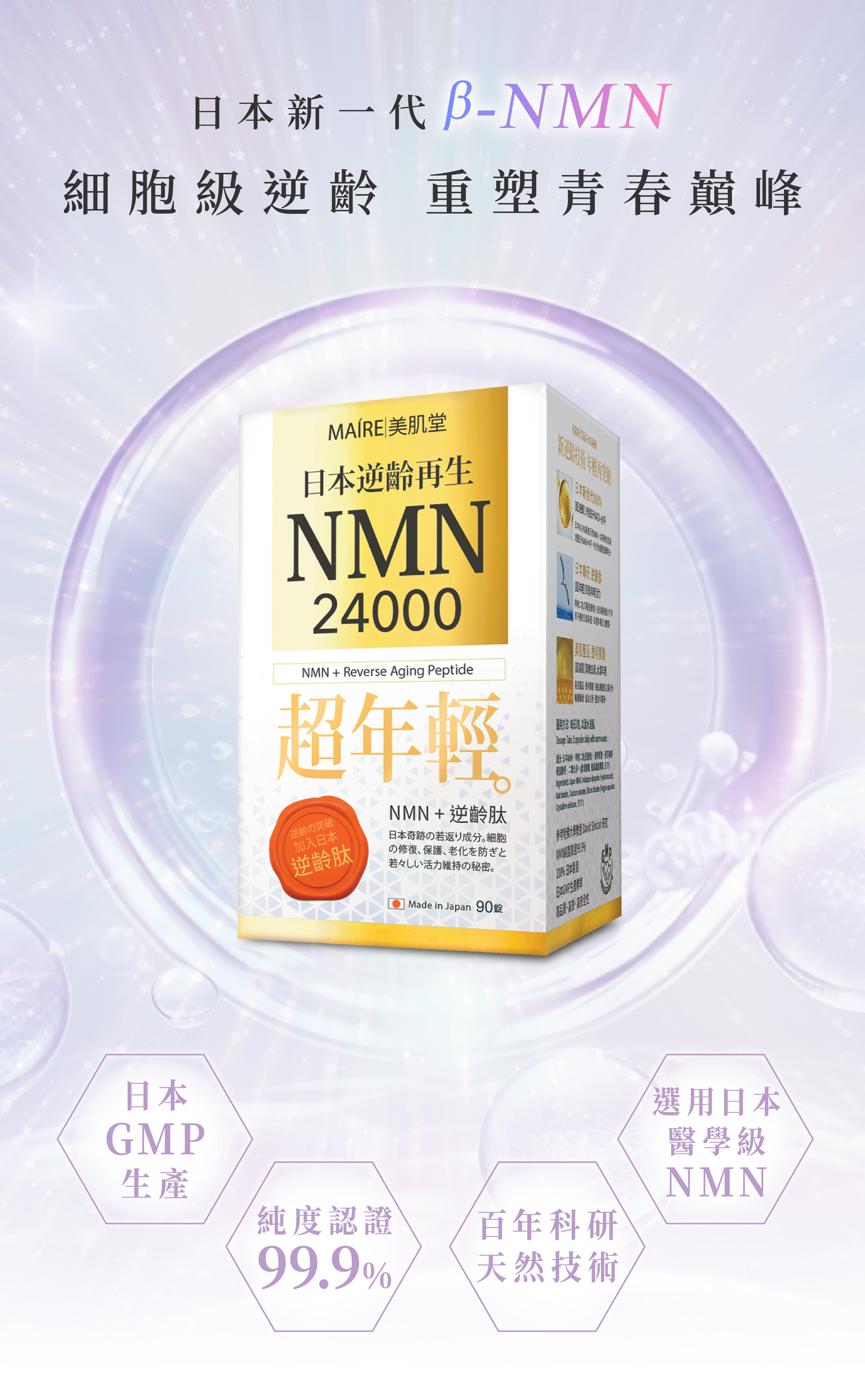 日本[MAIRE.美肌堂]採用最新的逆齡生物酶技術,成功提純達99.9%的新一代頂級天然β-NMN,遠超市面一般人工合成NMN,更精、更純、更易吸收。只需15分鐘,3倍提升體內NAD+青春因子水平,令全身細胞逆齡再生。科研實證,NMN有助激活細胞長壽蛋白,提升細胞修復力及再生力,幫您擊退歲月痕跡、減淡色斑皺紋、強化身體機能,回復青春活力!完美配方還加入了日本專研20年的珍貴成分[逆齡肽],助您抗疲勞、幫身體快速充電,回復年輕精神!最後加入美肌聖品[透明質酸],幫您鎖住水份、維持緊緻彈性,美肌效果驚人。每日只需2粒,令您由內而外美麗年輕,重拾年輕光彩!